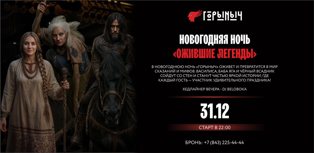 В эту ночь «Горыныч» превратится в мир, где оживают легенды. Василиса, Баба Яга и Чёрный Всадник спустятся со стен и станут героями яркого шоу. Вас ждёт полное погружение в атмосферу ресторана, где каждый зал ресторана заживет своей историей.